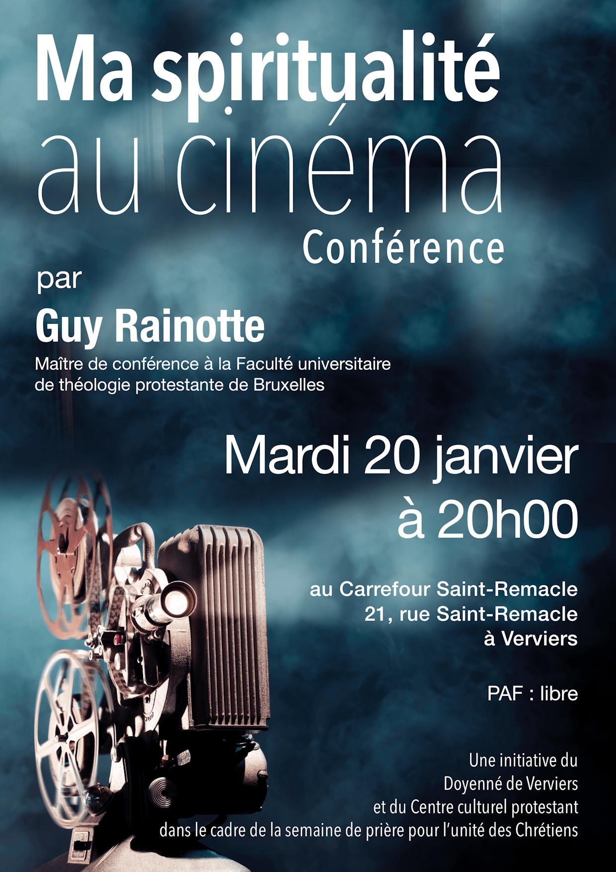 Sensible à une spiritualité qui se vit en dialogue avec la culture et une théologie qui s’en nourrit, Guy Rainotte se propose de partager l’expérience qu’il vit en salle de cours et d’explorer cet espace de résonances entre le cinéma et nous. Nous découvrirons quelles connivences il peut y avoir entre les procédés cinématographiques et notre expérience spirituelle, pourquoi l’art cinématographique est particulier et pourquoi la “toile” et les cinémas peuvent être lieux de rencontre et de vécu spirituel.